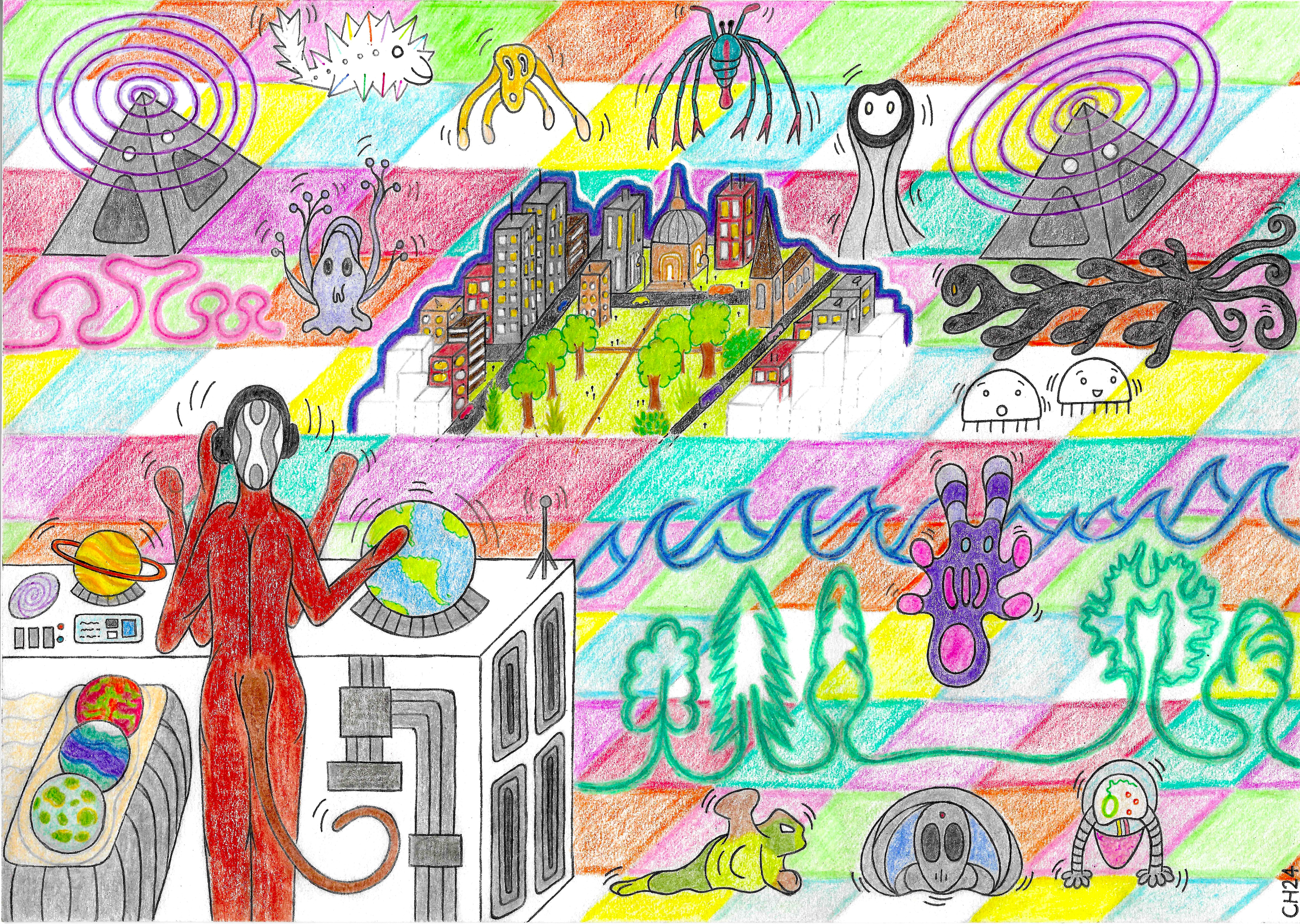 art, astronomy, climate, co-operation, communication, cosmos, courage, drawing, earth, existence, future, hope, humanity, humans, imagination, life, mental health, peace, planet, resistance, solidarity, space, stars, strength, time, universe, worlds